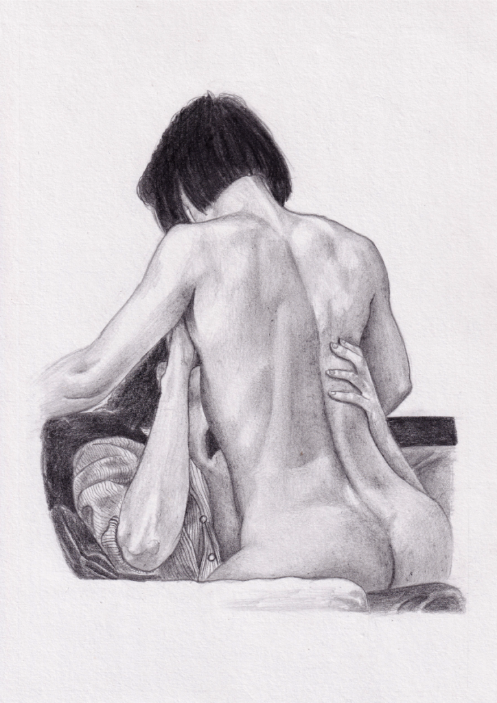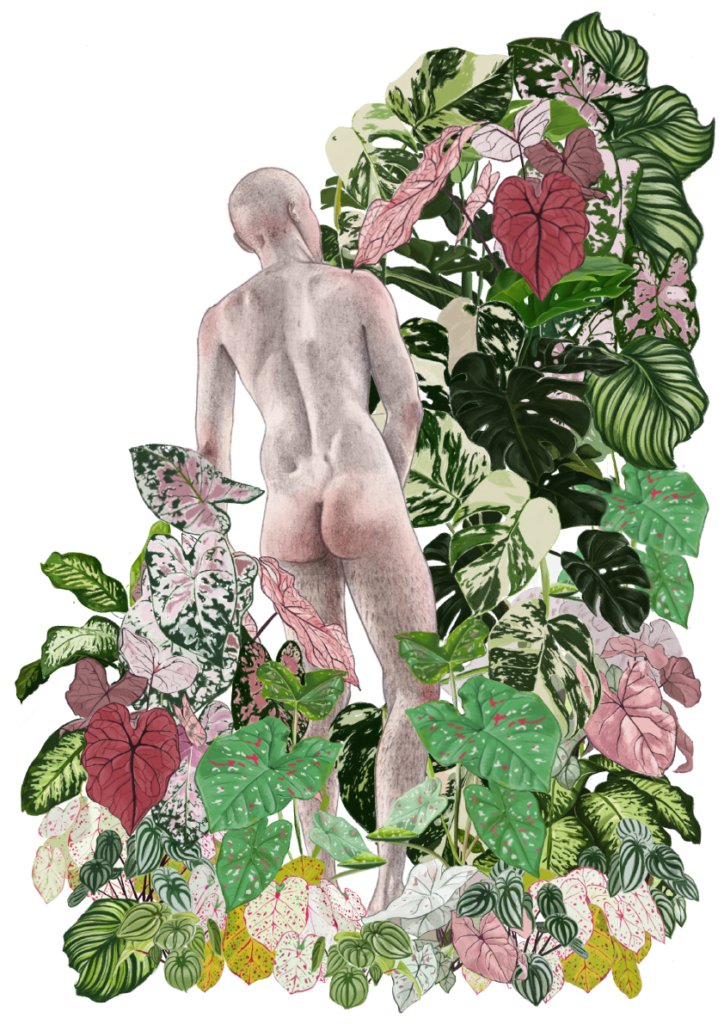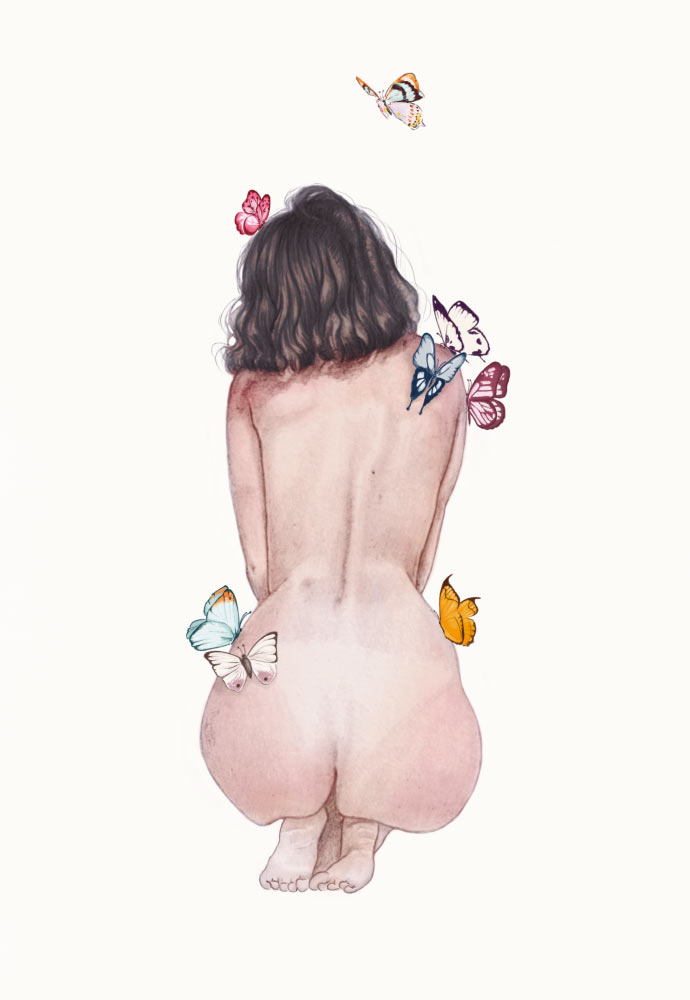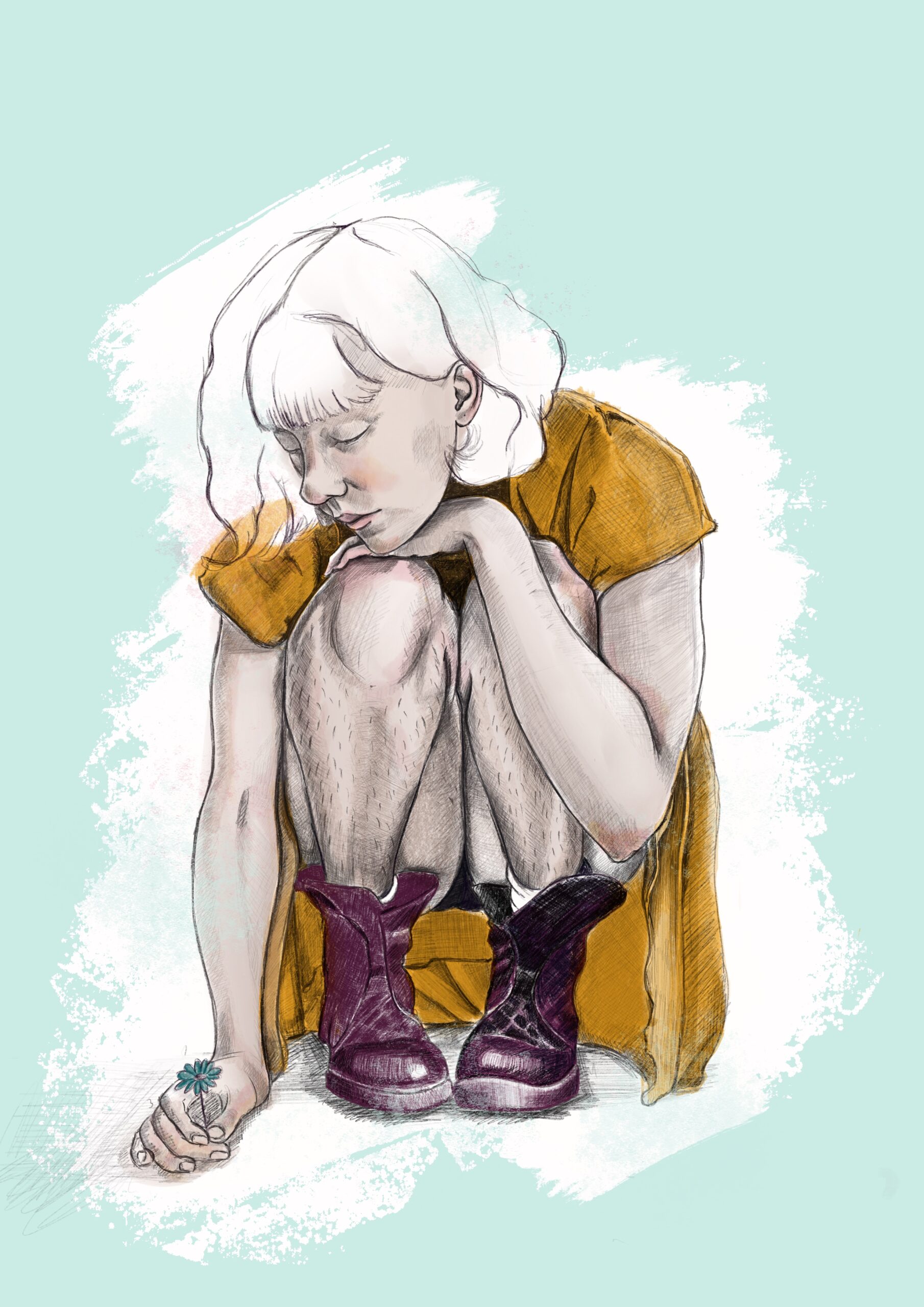 • femme a croupi de face, la tete posé sur ses genoux, une main sous le maton, lautre entrain de toucher une fleur délicate