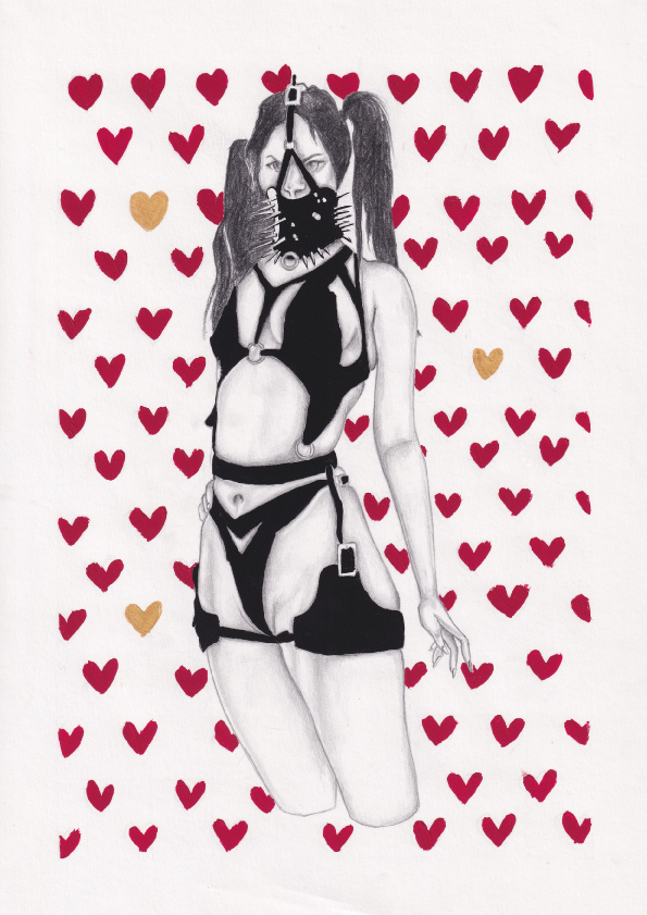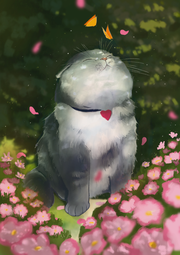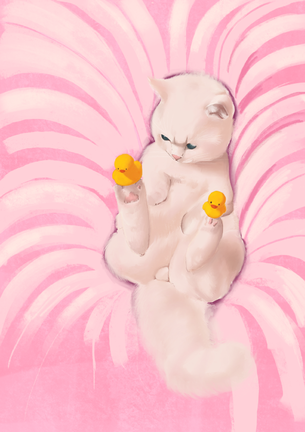 • Illustration d'un chaton blanc un peu ronchon, dans un décor rose. Avec des petits poussins sur les pattes arrières. Illustration inspirée d'un réel instagram.